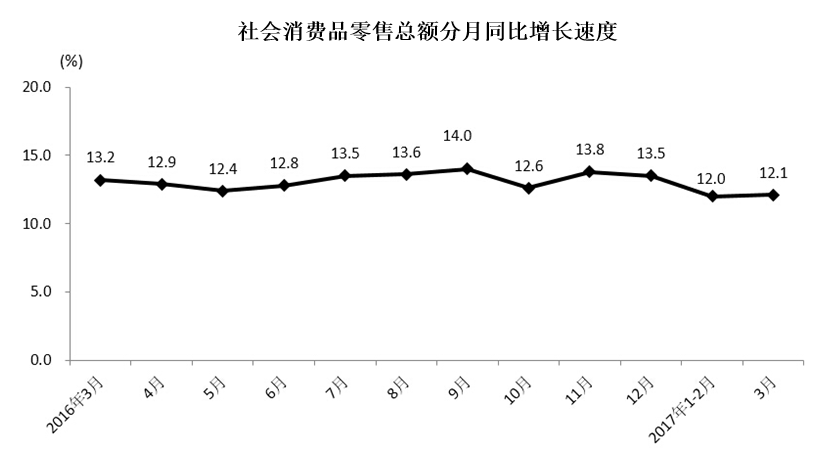 2017年1-3月份重庆社会消费品零售总额增长12.0%
