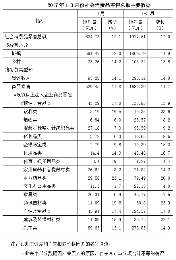 2017年1-3月份,全市实现社会消费品零售总额1977.51亿元,同比名义增长12.0%,较去年同期回落1.0个百分点;扣除价格因素,实际增长10.8%,较去年同期回落1.5个百分点(以下均为名义增长)。
