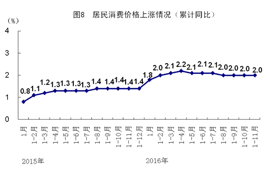 11月份,居民消费价格同比上涨2.3%,涨幅比上月上升0.2个百分点。1-11月份,居民消费价格同比上涨2.0%。分类别看,11月份,食品烟酒价格同比上涨3.2%,衣着上涨1.4%,居住上涨2.0%,生活用品及服务上涨0.3%,交通和通信价格持平,教育文化和娱乐上涨2.2%,医疗保健上涨4.4%,其他用品和服务上涨4.2%。在食品烟酒价格中,粮食价格上涨0.7%,猪肉价格上涨5.6%,鲜菜价格上涨15.8%。从环比看,11月份居民消费价格比上月上涨0.1%。